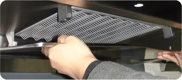 首先拆卸格栅:关闭电源前打开隔烟屏,双手拉住格栅左右两侧,向外拉即可打开格栅,将格栅向下旋转一定角度,并向外抽拉即可将其卸下;然后,同样用浸有中性清洗剂的软抹布清洗格栅并擦拭进风口圈外表面。